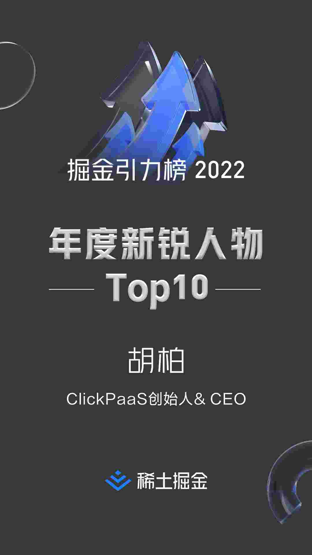 2022年1月6日,,,,,,,,,,,,稀土掘金社区第一届「掘金未来大会」成功举办,,,,,,,,,,,,会上发布了“2022 稀土掘金引力榜 年度新锐人物”榜单,,,,,,上海爱湃斯科技有限公司(简称EBPAY)创始人及CEO胡柏实力入选年度新锐人物TOP 10。。。。。。。